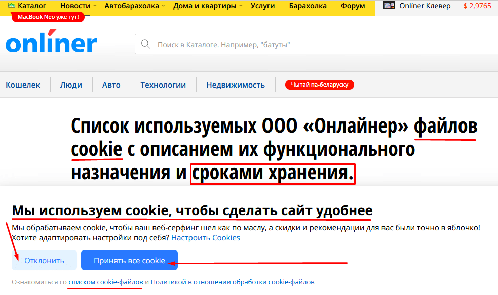 Настройки Cookies на сайте Ozon.by